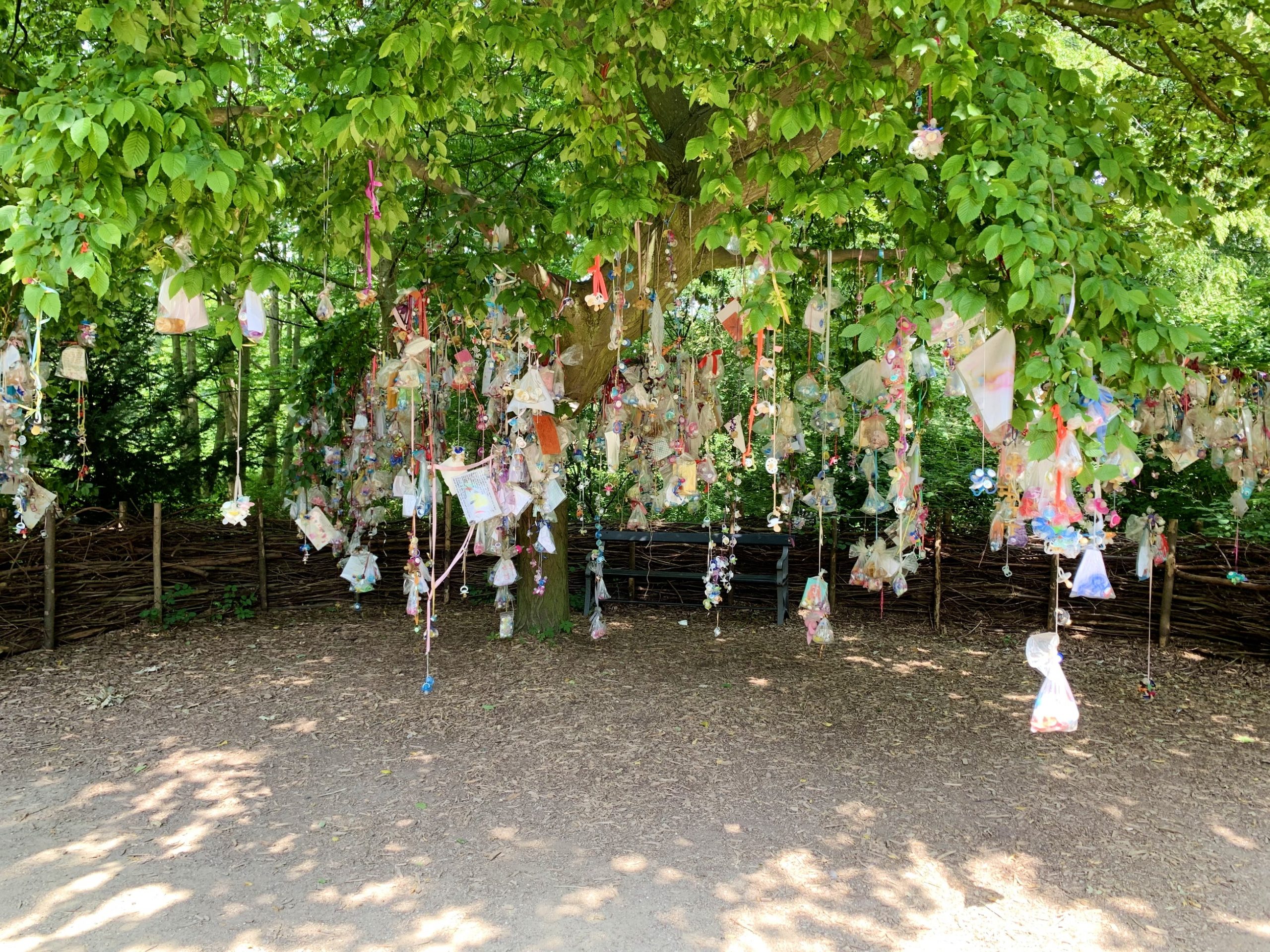De bekendste tutjesboom van Denemarken is die van Frederiksberg Have (de foto hiernaast) waar honderden tutjes met briefjes en/of tekeningen het hele jaar door de boom versieren.
